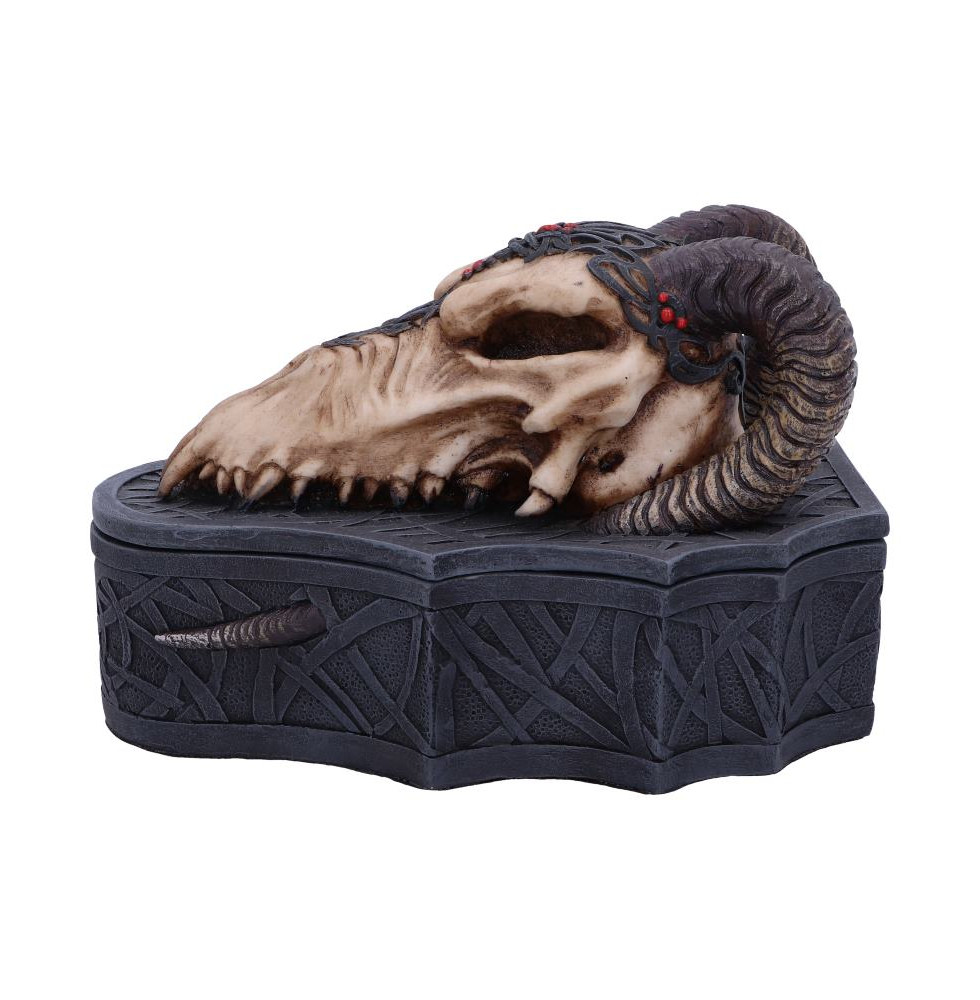 From the artwork of Monte Moore comes this Dragon Skull Box, perfect for any gothic lover. A skeletal dragon head with curled ram like horns and sharp teeth sits atop of a box which is perfect for storing your treasures. The box is covered in lines which weave in and out of one another, whilst the end of the dragons horns tear out at the sides of the box. This box has been cast in the finest resin before being expertly hand-painted.