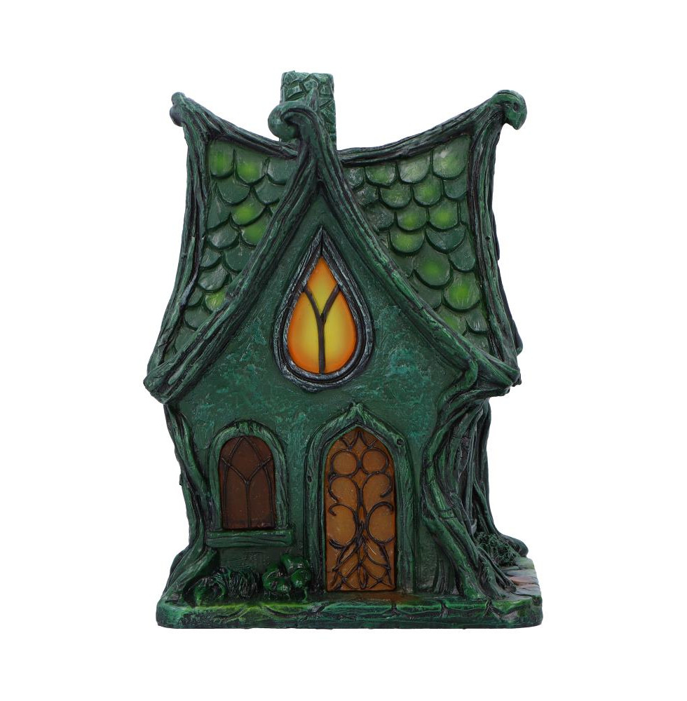 Evergreen Lodge Gothic-Inspired Fairy CottageEvergreen Lodge is a gothic-inspired fairy cottage that embodies the magic of an enchanted forest. With a pointed, angular roof featuring dark green, scale-like shingles, and five windowsfour of which are illuminated by LED lightsthis piece exudes medieval fantasy charm.Sculpted vines, tree roots, and curled roof edges enhance its forest-like atmosphere, while the dark green base, accented with lighter green details, adds depth and intrigue. The small chimney at the peak completes the rustic fairy-tale look.Ideal for garden dcor or fantasy-themed displays, Evergreen Lodge is securely packaged for easy merchandising. Perfect for retailers specializing in fantasy, medieval, or fairy-tale items, this captivating piece is sure to enchant customers looking to add a touch of magic to their home or garden.