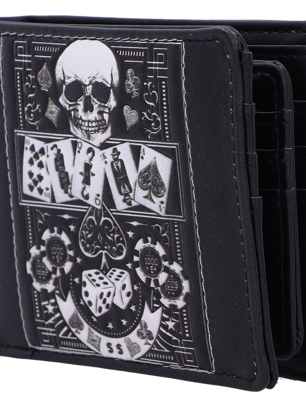 Unleash your daring style with the gothic 'Feeling Lucky?' Wallet. A fusion of edgy and playful elements, this wallet features a bold skull design surrounded by the allure of a poker table, complete with cards and dice. Crafted for both fashion and function, this statement piece adds an element of intrigue to your everyday carry and is the perfect addition to any gothic collection.