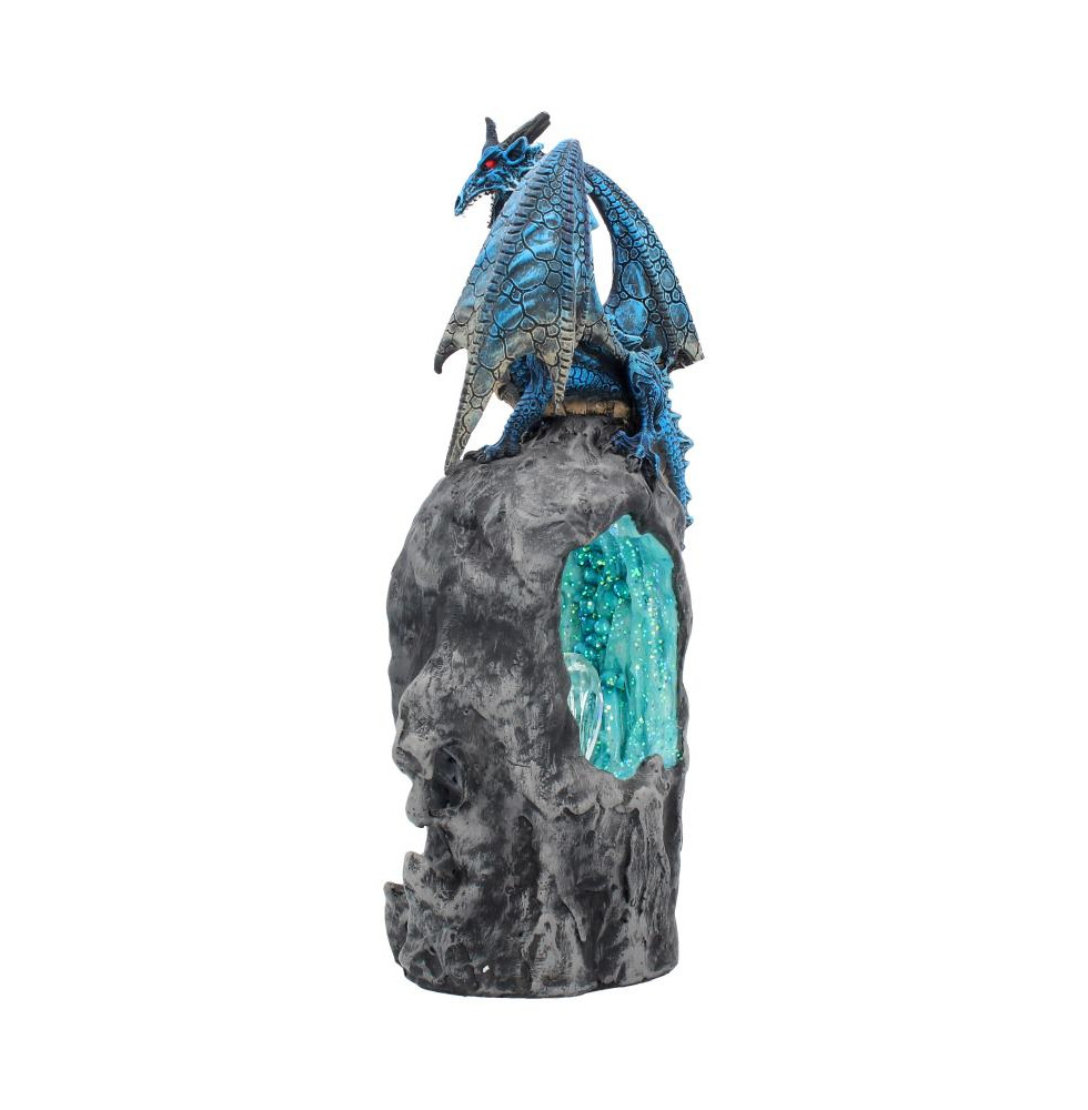 Open at the front, revealing the sapphire crystals within, a grey geode is protected by a Blue Dragon. Clambering over the top possessively, it raises its gold-tipped wings in a threat display to warn off intruders. Cast in high-quality resin before being painstakingly hand-painted, the crystal lights up with a colour-changing LED, adding an extra touch of menace and magic!