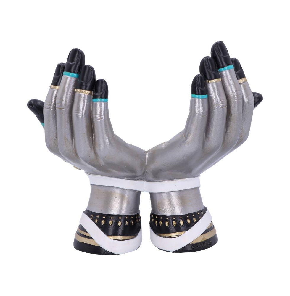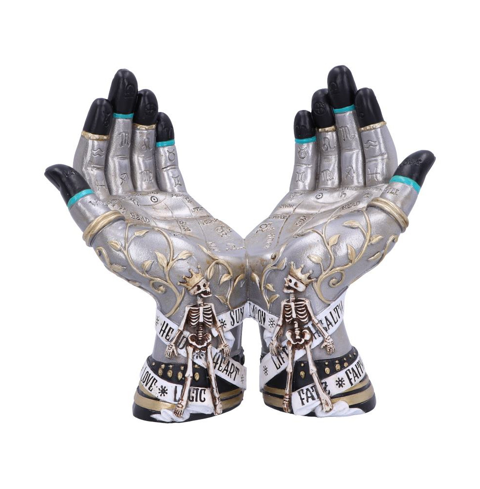 Ready to grasp onto your crystal ball, two silver hands can be seen. Decorated in traditional palmistry symbols. Two skeletons are located at the wrists of the hands, wearing golden crowns and standing in front of white ribbon which has been inscribed with the various words which correlate with the art of palm reading. Cast in the finest resin before being expertly hand-painted, this crystal ball holder is the perfect addition to any alternative home or spiritual collection.