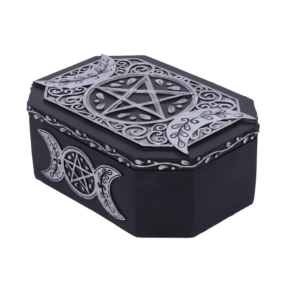 From the Goddess of Magic and Spells, comes this stunning Hectate's Protection Box. Decorated in ornate silver detailing, the top of the lid and sides of the box have a triple moon pentagram on them which is a popular pagan and wiccan symbol used to represent the goddess. The lid of the box lifts off to reveal the box compartment which is perfect for storing all your little treasures. Cast in the finest resin before being expertly hand-painted, this Hecate's Protection box is ideal for any lover of wiccan and witchcraft.