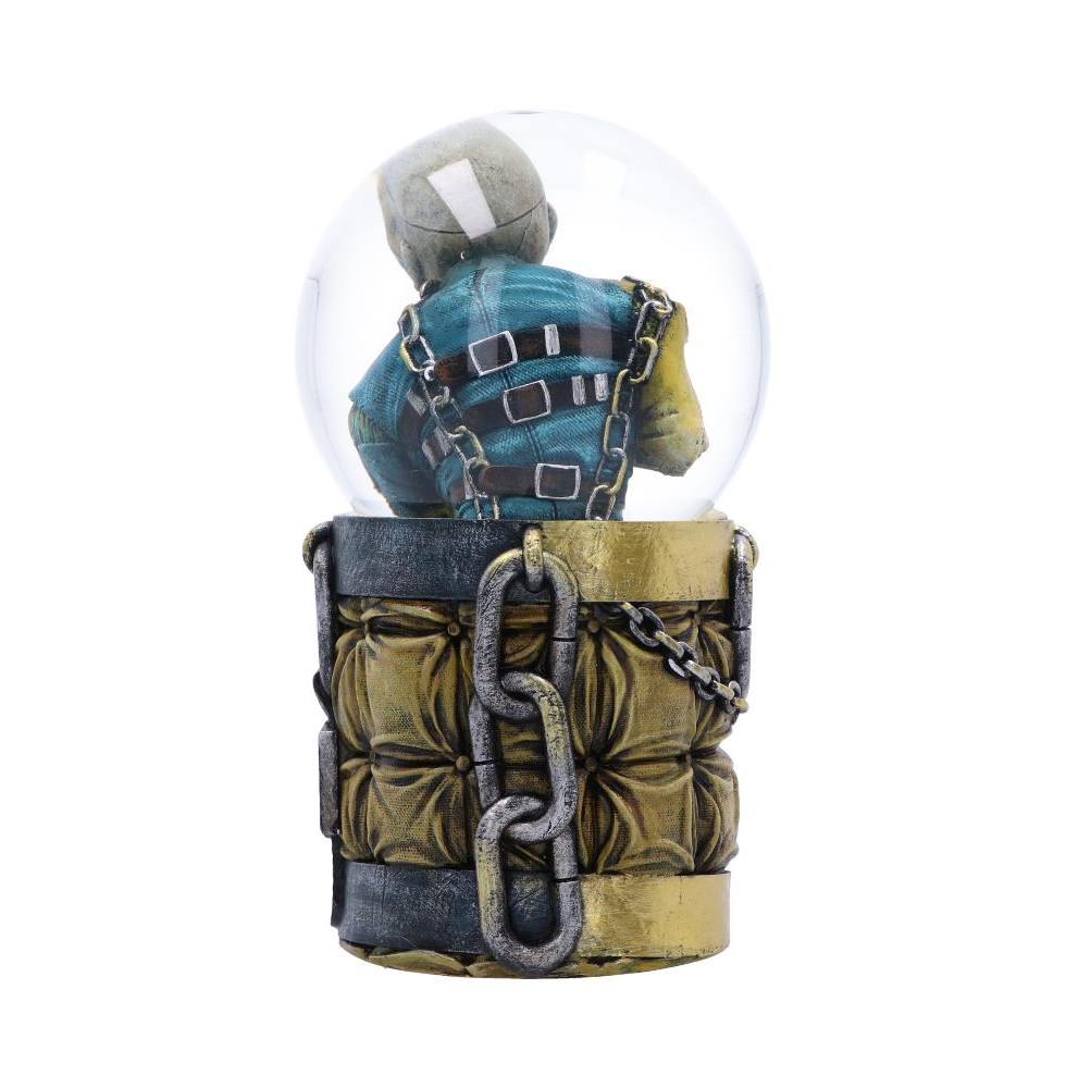 Show your allegiance to the Monsters of Rock with this electrifying and Officially Licensed Iron Maiden Piece of Mind Snow Globe. Featuring the bands music icon Eddie as he leans forward restrained by a straightjacket and chains in his glass globe. He can be seen intimidating anyone that passes by with his menacing stare. The base of the snow globe is surrounded by padding to resemble Eddie being trapped within an asylum. Cast in the finest resin with a glass globe and expertly hand-painted, this Iron Maiden Piece of Mind Globe will bring terror and excitement to any Maiden fan's soul.