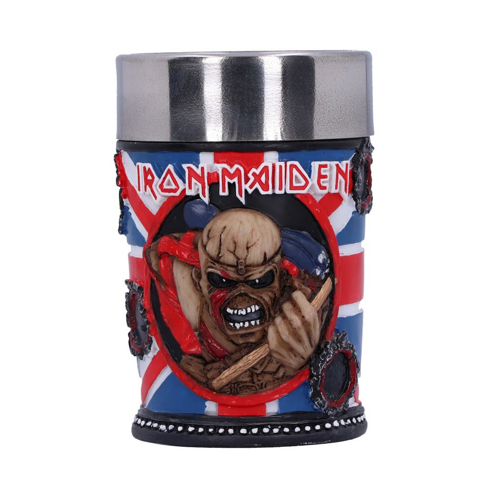 Show allegiance to the Monsters of Rock with this electrifying and officially licensed Iron Maiden shot glass, created by Rock and Roll masters Nemesis Now. Eddie the Trooper charges forward, embodying the ferocious determination and dedication the band have shown through the decades. The reverse of the shot glass is a waving union jack, perfect for toasting to fallen troopers. Cast in high-quality resin and hand-painted, each comes with a removable stainless steel insert so you can spend less time cleaning and more time rocking!