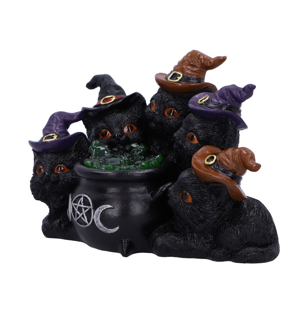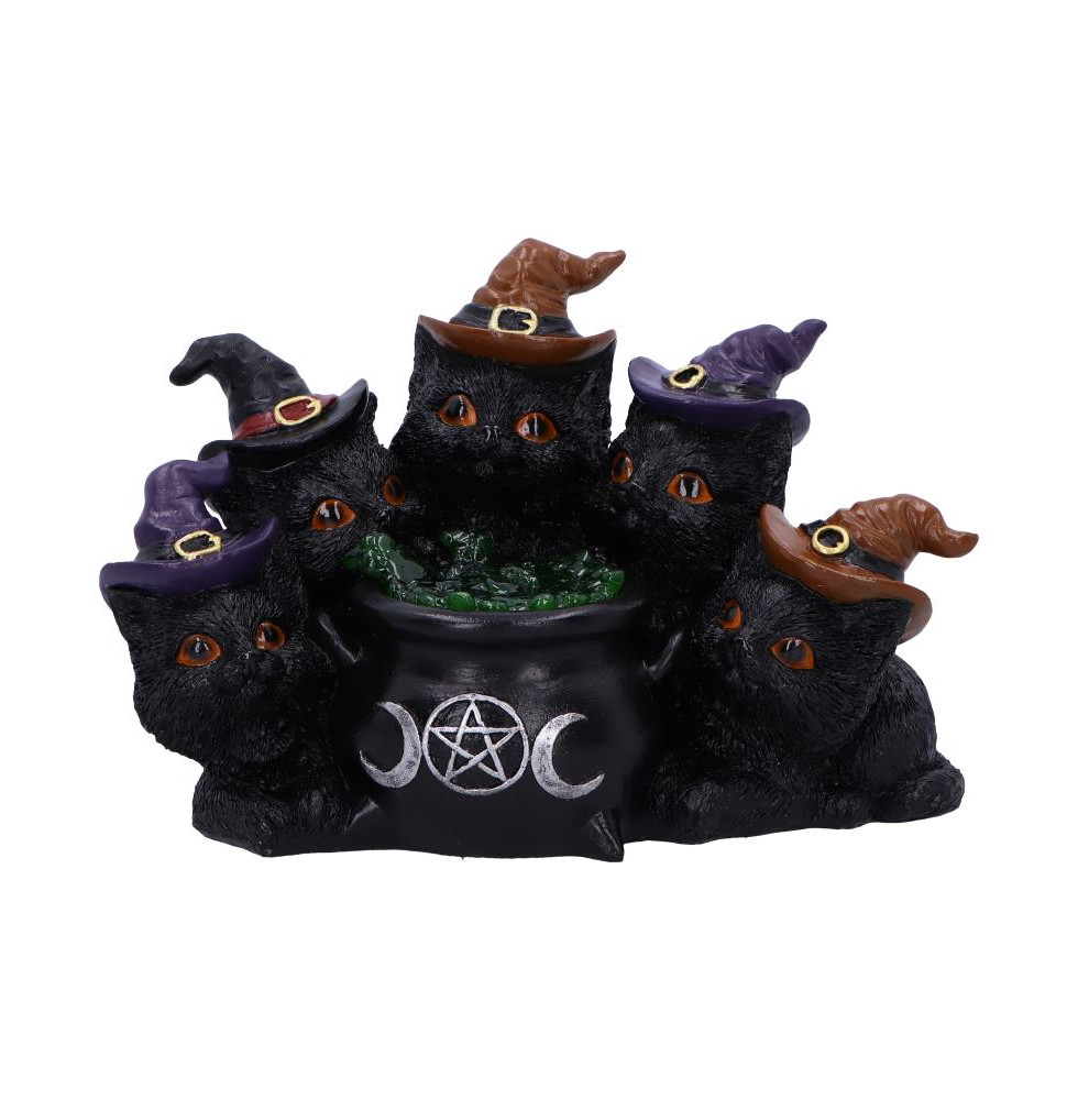 Introducing Kindle's Potion, a bewitching ornament perfect for cat lovers and fans of all things magical. This enchanting piece features five mischievous black cats donning witch hats, gathered around a glowing cauldron filled with a magical potion. Crafted from high-quality resin and meticulously hand-painted, each ornament is a unique treasure from Nemesis Now's exclusive cat decor range. With its illuminating potion requiring just 2 AA batteries, Kindle's Potion brings a touch of mystical charm to any space. Arriving securely encased in a protective polystyrene cover and boxed for safe delivery, its the ideal addition to your collection or a spellbinding gift for a fellow enthusiast.