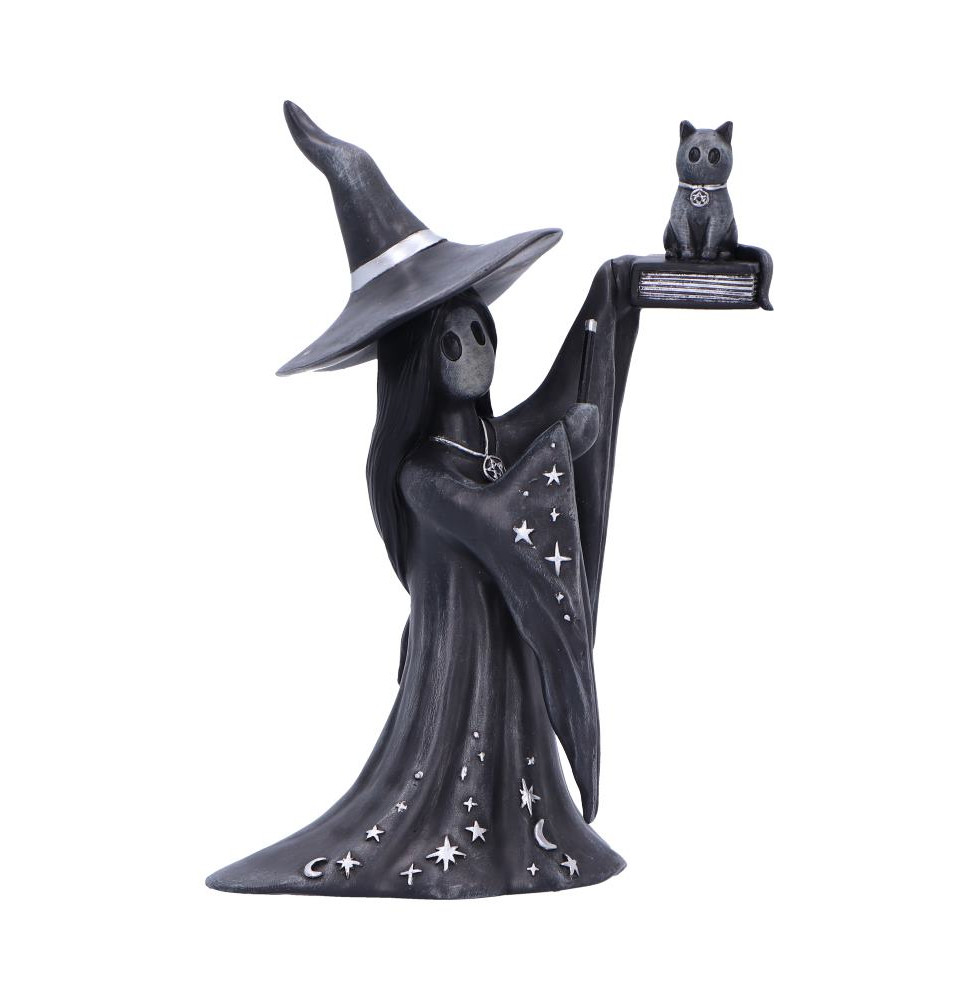 The Little Souls Spell Cat Lady figurine is a 12.5cm tall original Nemesis Now, designed to enchant lovers of magic cats and gothic charm. It features a black witch soul raising a spell book, with a cute black cat perched on top, and silver moon and star accents adorning her flowing cloak. Packaged in a full colour Little Souls Nemesis Now gift box, it's perfect for gifting or display. Ideal for fantasy collectors, cat lovers, and fans of mystical decor, this whimsical figurine adds a magical touch to any shelf or space.
