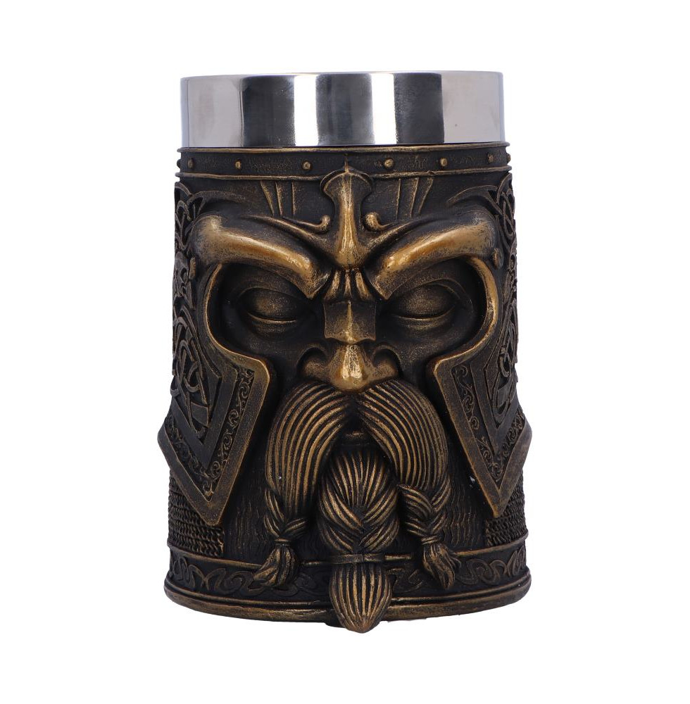 Embrace the power of Norse mythology with this officially licensed Odin tankard from Nemesis Now. Crafted from dark gold resin, the tankard showcases a detailed sculpt of Odins face, complete with a helmet and flowing beard, and includes a removable stainless steel insert for easy cleaning. It comes safely packaged in a Nemesis Now box, making it perfect for collectors or as a unique gift. Ideal for fans of Viking lore, fantasy enthusiasts, and lovers of gothic decor, this tankard is your ultimate vessel for legendary drinks.