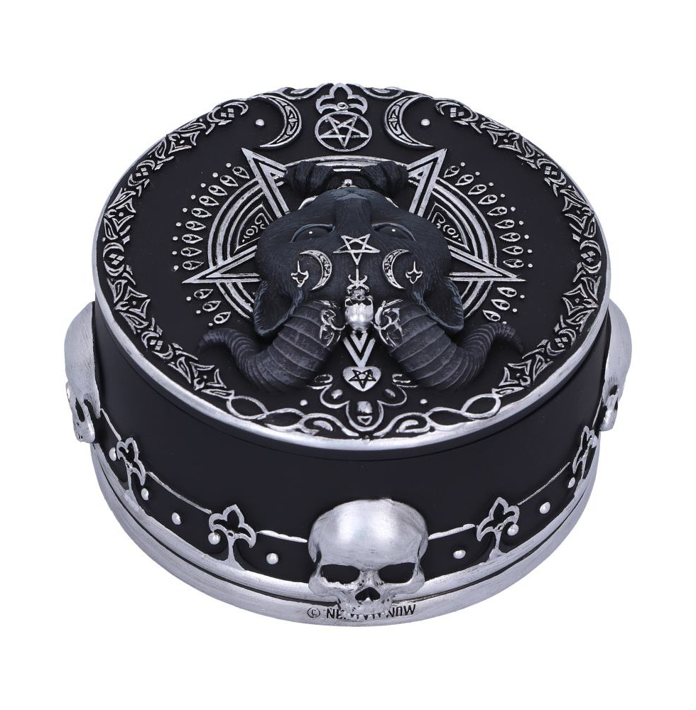 From the bewitching mind of our in house design team comes this Pawzuph Trinket Box. Pawzuph the union of good and evil features on the lid of the trinket box staring up at you adoringly. As you look into their black eyes you notice the darkness that resides within. The trinket box is decorated in ornate silver detailing and satanic symbology and is cast in the finest resin before being expertly hand-painted. This trinket box is perfect for any gothic lover or collector of Nemesis Now's Cult Cuties range.