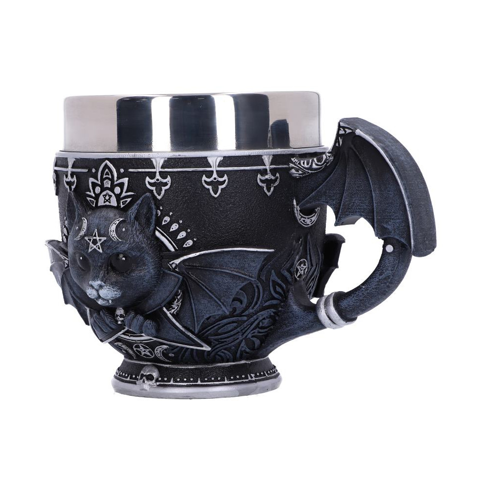 Sip on your favourite beverage and raise your pinky with this Pinkys Up Malpuss cup. Malpuss the union of good and evil stares at you adoringly, as you look into their black eyes you notice the darkness that resides within. Decorated in ornate silver detailing, the handle of the cup is shaped like Malpuss's bat wings. Cast in the finest resin before being expertly hand-painted, this Pinkys Up Malpuss cup is perfect for any gothic lover or collector of Nemesis Now's Cult Cuties range.