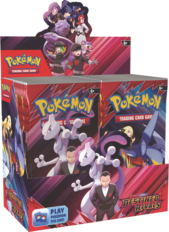 Pokémon Trainers, be on high alert! The nefarious Team Rocket is setting its latest plan into motion, and heroic Trainers are racing to stop it. Join forces with the likes of Cynthia and Garchomp ex, Ethan and Ho-Oh ex, or Arven and Mabosstiff ex… Or reconsider your loyalties and fight alongside Team Rocket’s Pokémon like Mewtwo ex—under the command of Giovanni! Choose a side, assemble your allies, and battle boldly in the Pokémon TCG: Scarlet & Violet—Destined Rivals expansion!