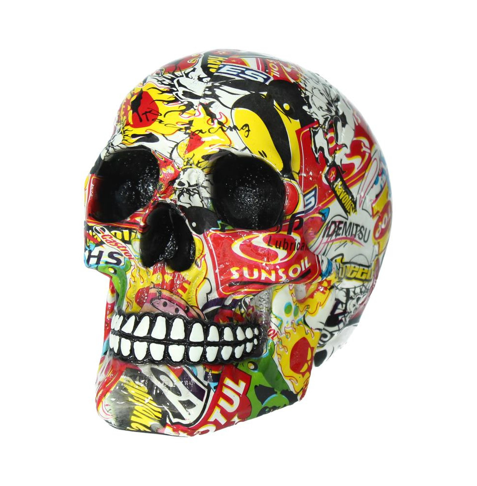 From alternative brand Nemesis Now's giftware collection, this skull is an exciting celebration of modern art. Sunken eyes and nasal aperture painted a deep black, this skull is covered in a riot of colour, pop art of skulls blending with repurposed corporate logos and cartoons to create an effect between Andy Warhol and Roy Lichtenstein. Cast in the finest resin, this skull is a perfect way to show your love of the art movements of the 20th century in your own home.