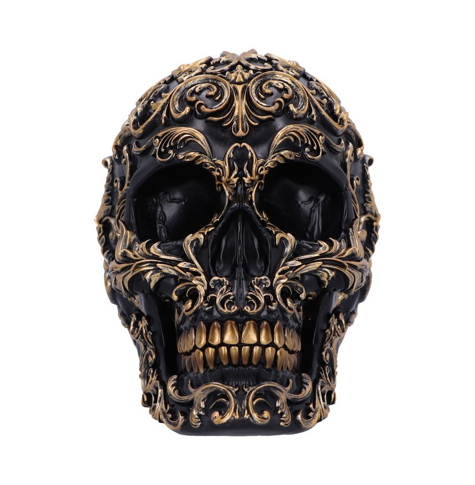 Embrace the captivating fusion of Gothic allure and Victorian splendour as intricate gold Baroque designs adorn the entirety of the skull. Gleaming gold teeth add a touch of opulence to this hauntingly beautiful piece. Cast in the finest resin before being expertly hand-painted, this unique skull is sure to captivate all who behold it.