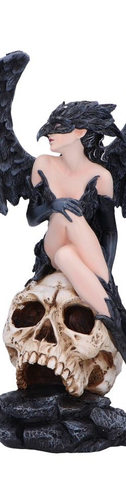 Riven Gothic Winged Figurine Seated on SkullRiven is a dark fantasy figurine featuring a winged female figure seated atop a weathered skull. Hand-painted in black and bone tones, ideal for gothic, mystical, or alternative home dcor setups.