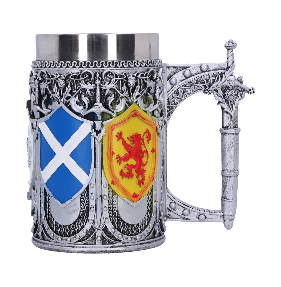 Created by heritage masters Nemesis Now, this Scottish tankard embodies everything that is Scotland. The mug is backed by intricate silver thistle patterns as shields are raised from the curved sides. Alternating Robert the Bruce, Saltire (Saint Andrew's Cross or the crux decussata) and White Thistle shields as separated by long swords. The handle is very ornate, featuring a large sword as the centrepiece while also being decorated with the same intricate patterns that feature on the cup. Cast in the finest resin before being lovingly hand-painted, this tankard features a stainless steel insert for ease of cleaning and is the perfect piece to celebrate your Scottish heritage.