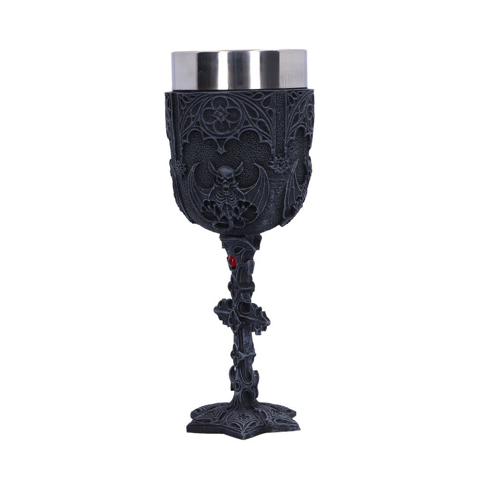 This Gothic goblet was created by alternative brand Nemesis Now's alternative giftware collection. The cup is adorned with large skeletal Vampire bats under cathedral-esque arches. The stem is formed from an ornate cross, whose patterns carry on to the base. A small red jewel is placed just below the cup to add a touch of romance. Cast in the finest resin before being painstakingly hand-painted, this goblet is perfect for anyone who has a passion for blood-sucking monsters.