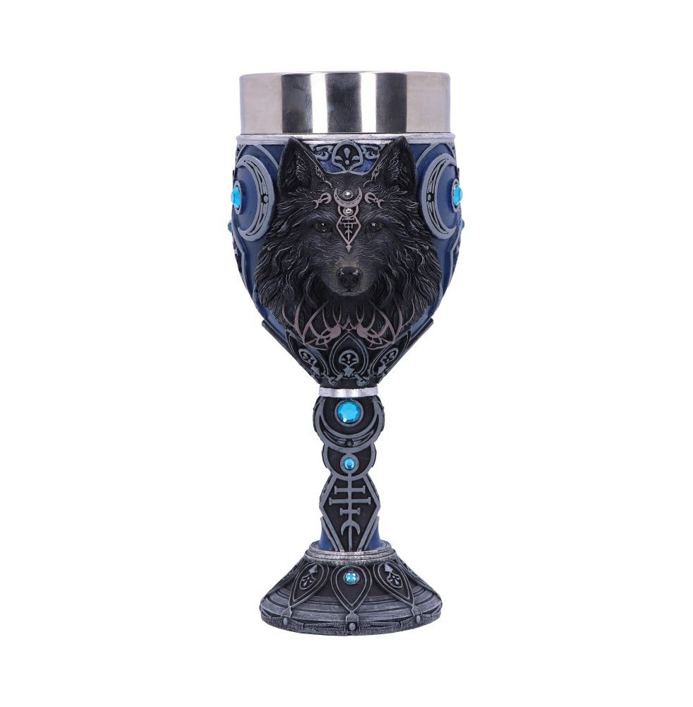 This beautiful dark wolf stares straight ahead, piercing the souls of all who catch its gaze. Channelling the spirit of the wolf moon, this beast has the lunar phases emblazoned across its head to the bridge of its nose. Aquamarine jewels gives a soft glow to otherwise gothic Goblet. The lunar phases are also placed on the sides of the goblet aswell as being surrounded by beautifully precise detaling and patterns. Cast in the finest resin, before being expertly hand-painted, this stunning goblet will be perfect for any gothic or spiritual lover.
